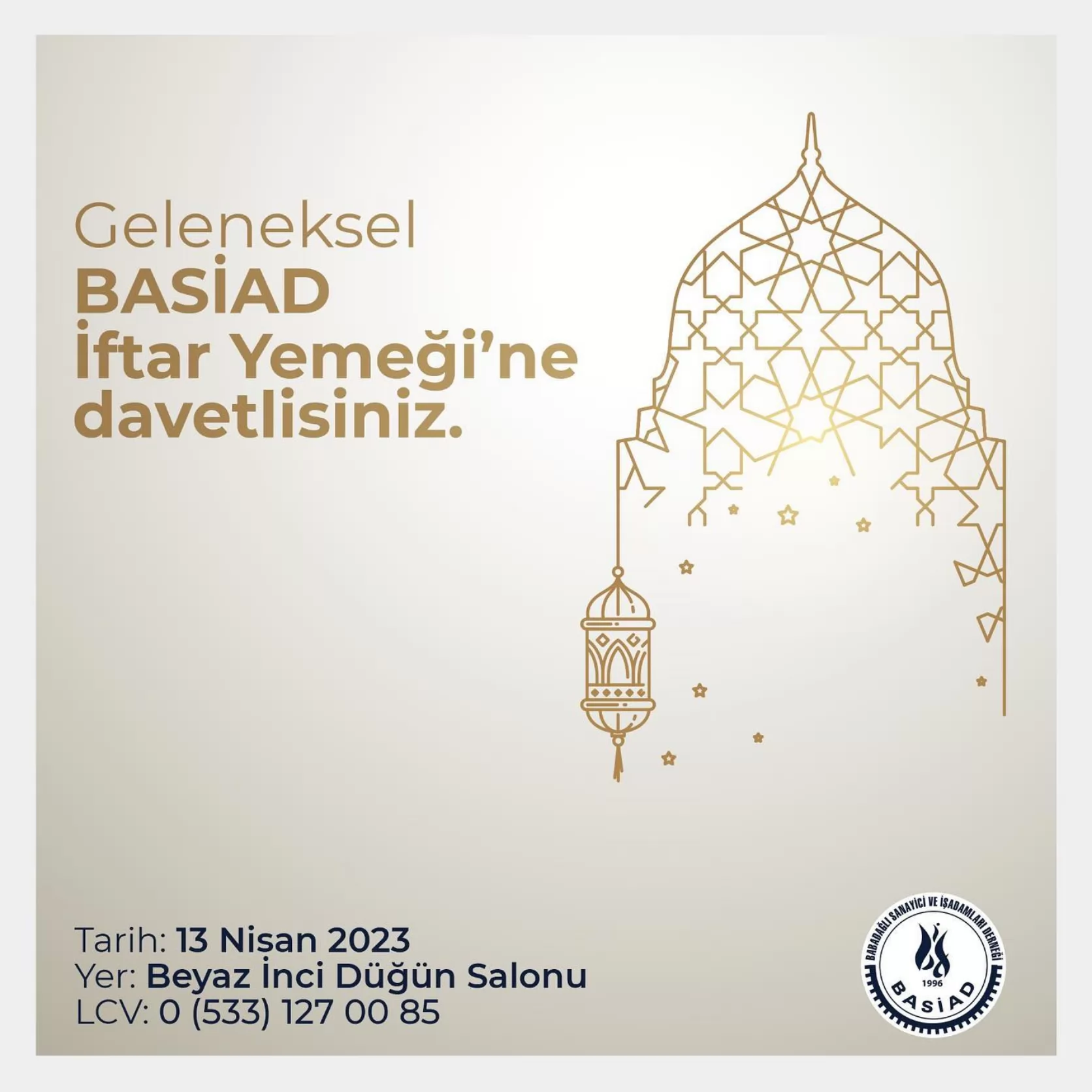 Denizli İl Müftüsü Mehmet Aşık'ın katılımlarıyla 13 Nisan 2023 tarihinde gerçekleşecek olan Geleneksel BASİAD İftar Yemeği’ne tüm üyelerimiz davetlidir. Katılımınızı kişi sayısı ile birlikte bildirmenizi rica ediyoruz. LCV: 0 (533) 127 00 85
